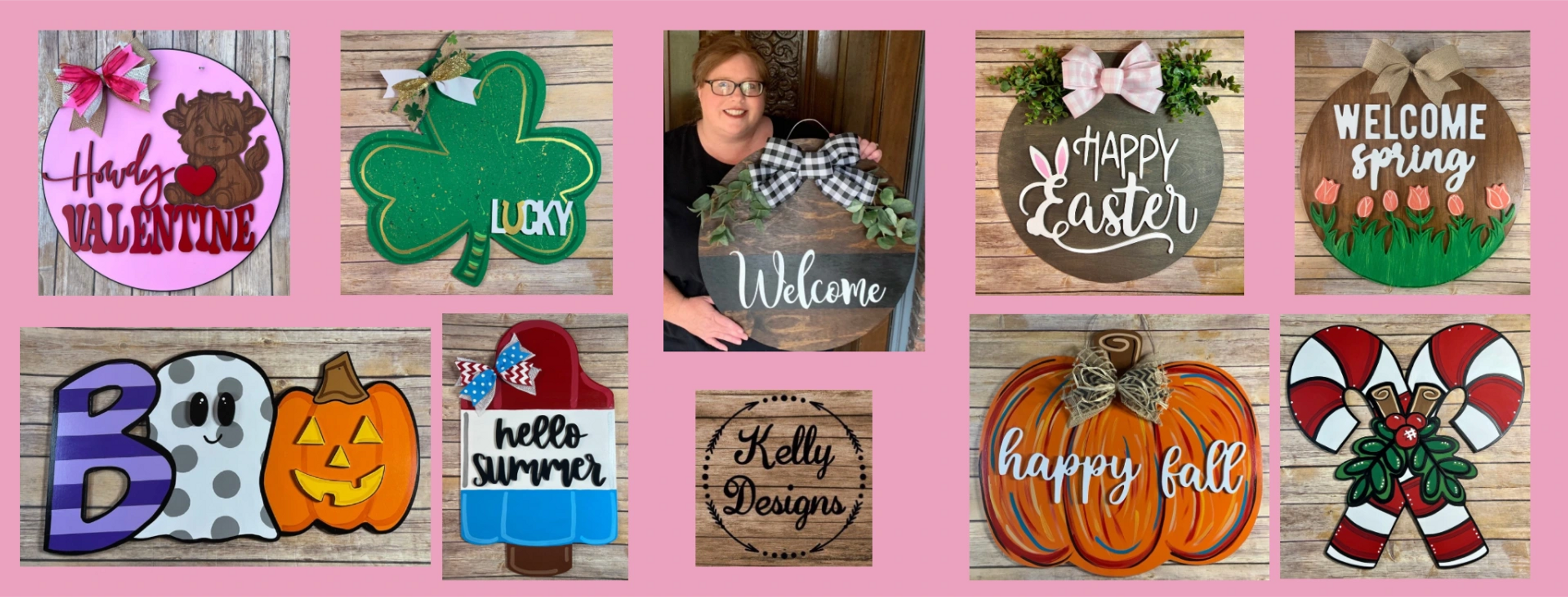 Kelly Designs! I am a wife of 29 years, and a mom of two adult children ages 26 and 24. I started my business in 2017 making glasses, wood signs and T-shirts. I found my passion for painting in 2018 when I made my first door hanger. And I was hooked.